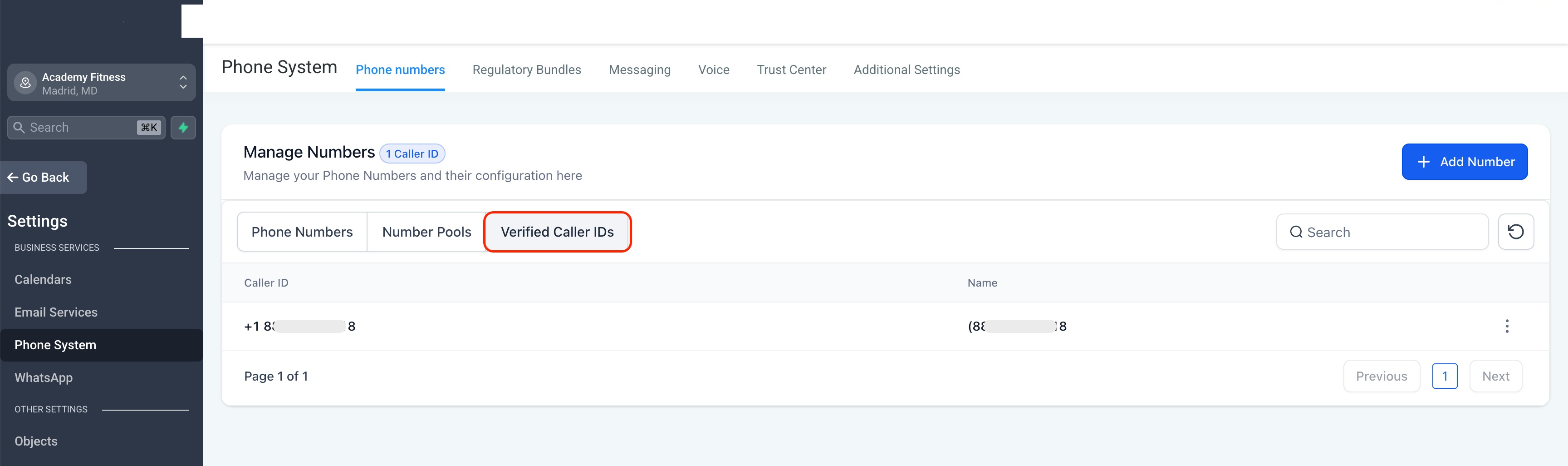 • To check settings of your existing phone number (Verified Caller ID), go to account settings > Phone System > Phone Numbers > Verified Caller ID